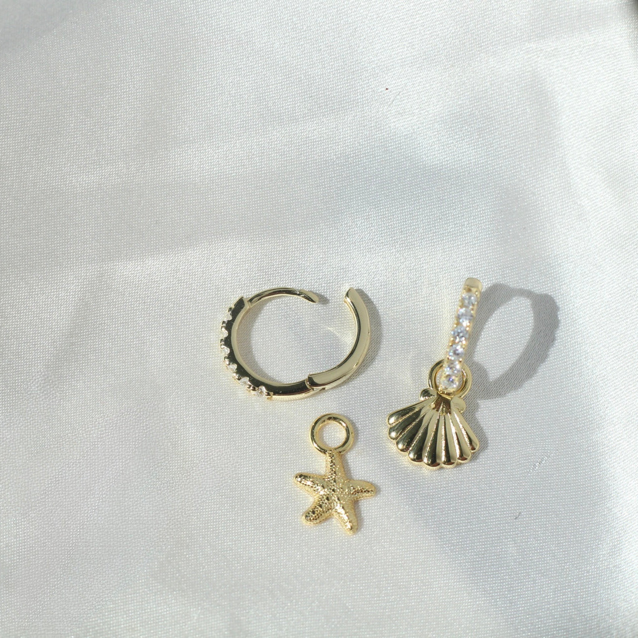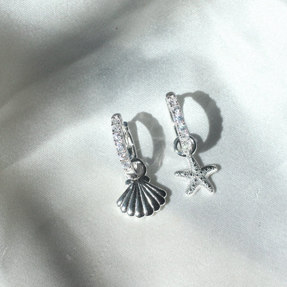 Mismatched seashell and starfish charms shimmer on a 11mm pave hoop earring. Get two earrings in one with these beautiful hoops that feature removable charms.