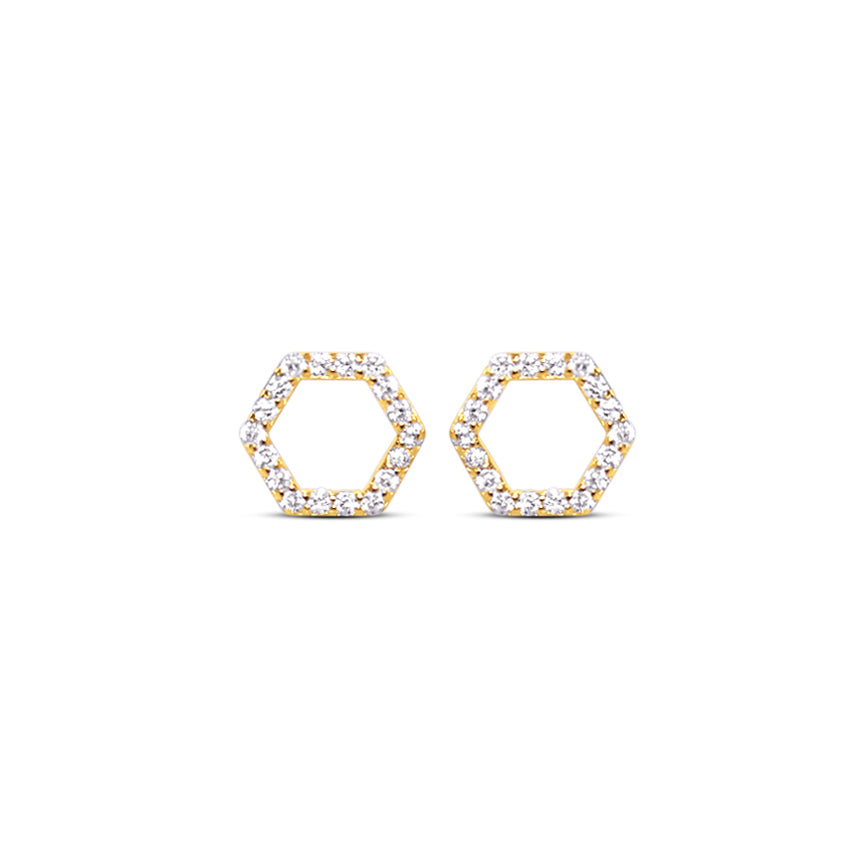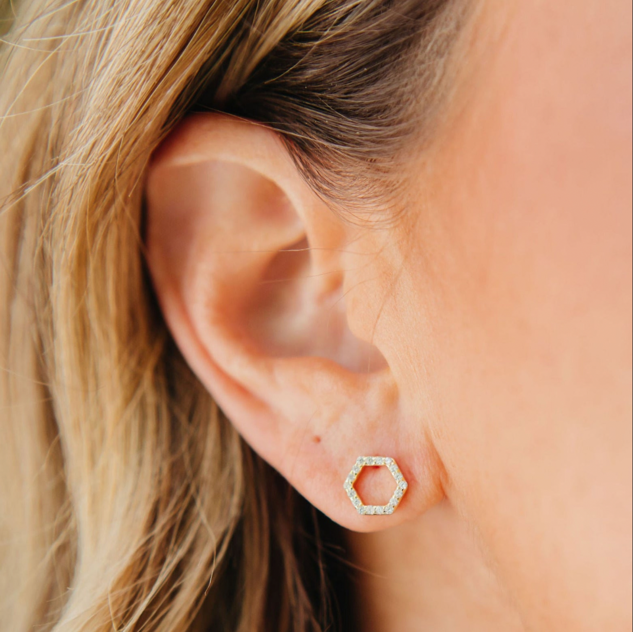 Dainty Hexagon Shaped Stud Earrings with White Pave Cubic Zirconia Detail.