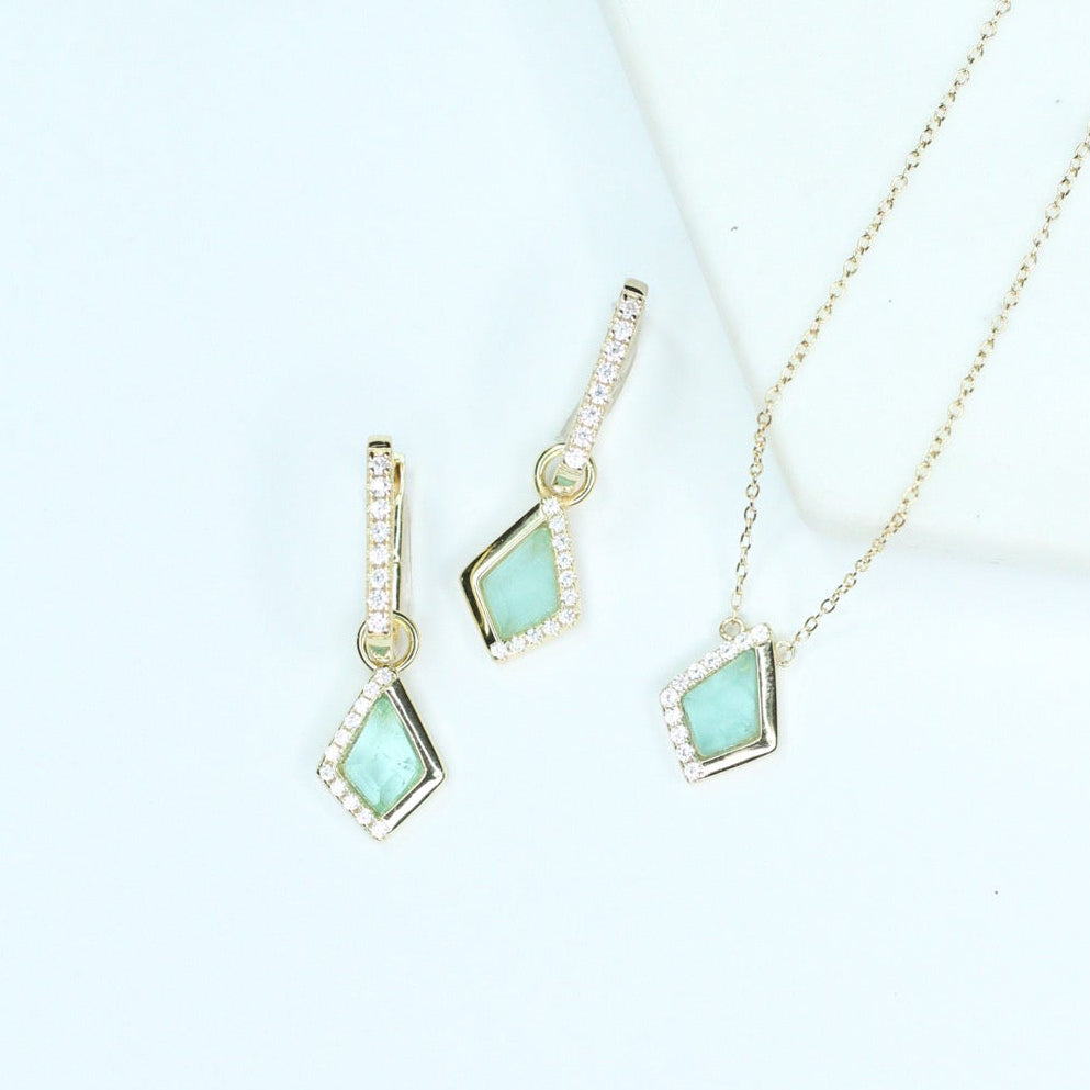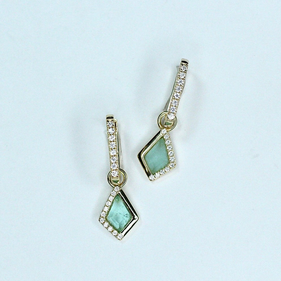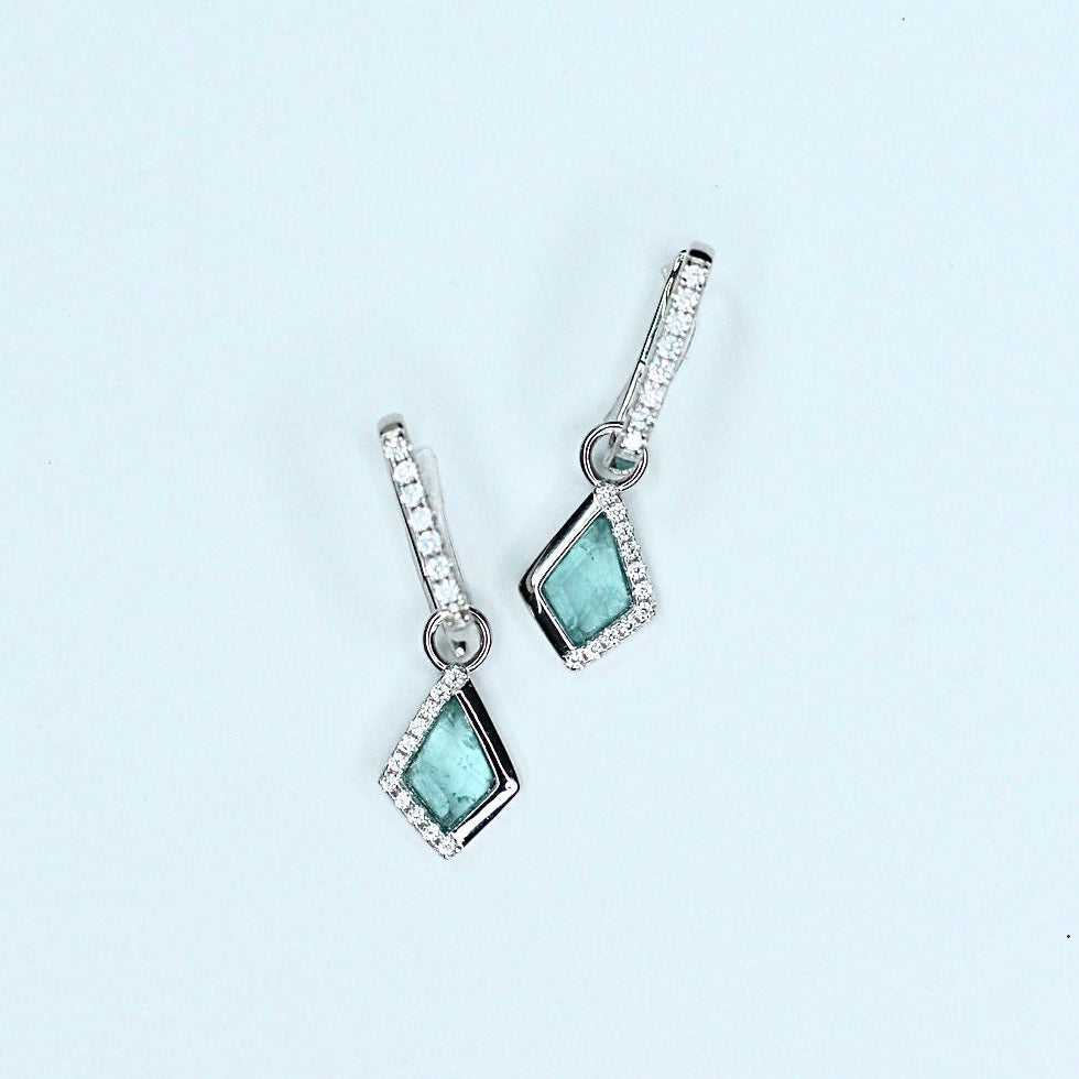 Elevate your ear stack with the dreamy glow of our Tranquil Sea Glass Kite Charm Earrings. Featuring a sleek kite-shaped charm in a soothing blue-green hue, each piece is accented with pavé-set stones along one side for the perfect touch of sparkle.